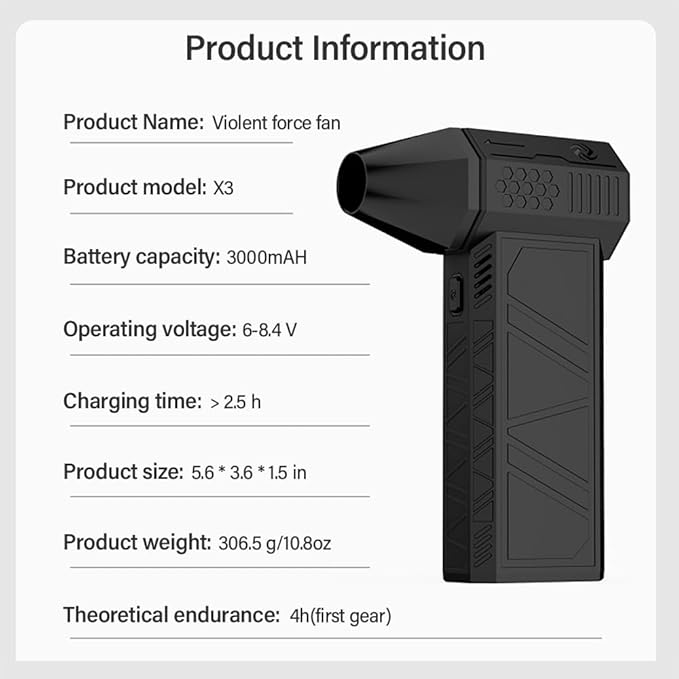 【Long-lasting Battery Life】The small turbo jet fan comes with two built-in 21700 power batteries, each with a capacity of 3000mAh. With excellent endurance, it can sustain usage for approximately 15 minutes on the highest setting