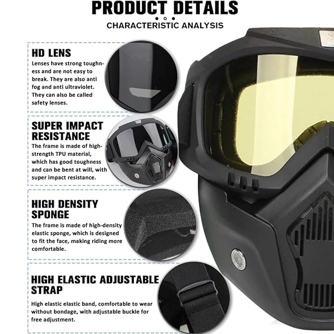 BUILT-IN REMOVABLE MASK WITH UV PROTECTION: This ShopiMoz Motorbike Open Face Goggle Mask is a windproof, anti-fog and anti-dust motorcycling goggles with a mouth filter and holes. It offers the best face protection from dust and other harmful elements and provides better air permeability.